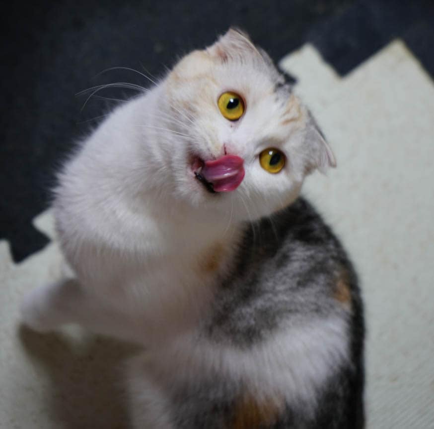 すごく大人しいです。基本的にスコティッシュフォールドは気性が大人しいので飼いやすいです。立ち耳ですがスコの場合、耳が上ではなく横から出て、また顔がまんまるっこいので可愛いです。